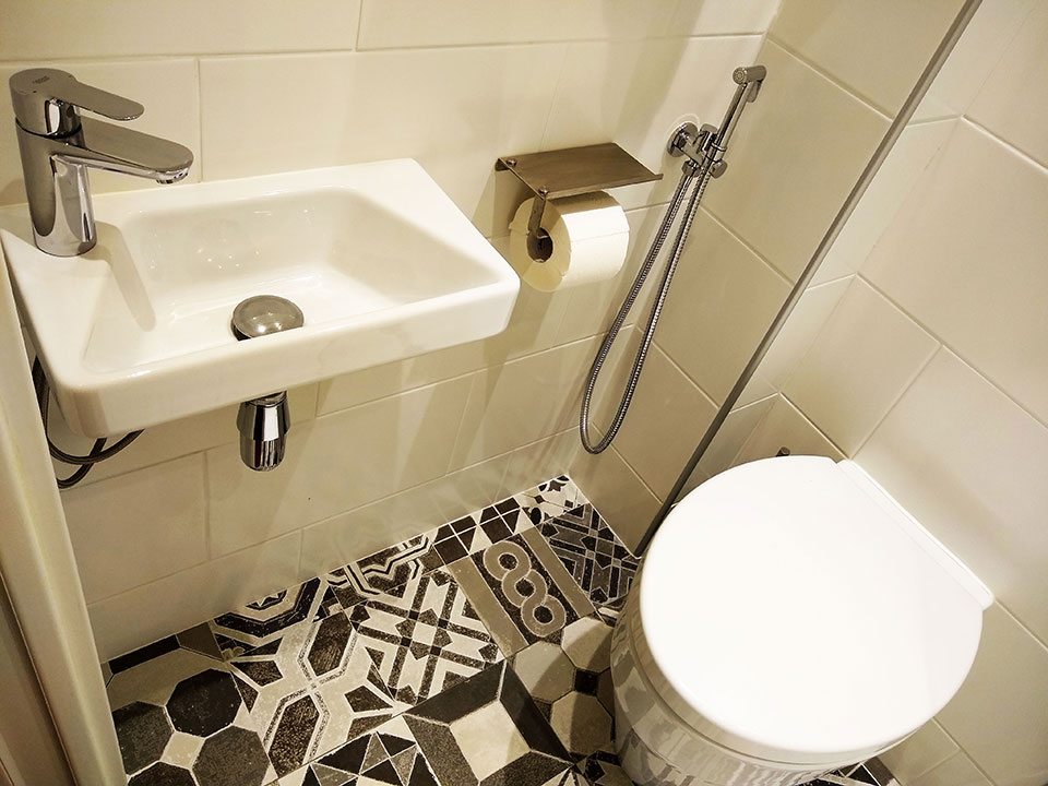 Enter the property from a quiet stone-paved street. A door to the right takes you to apartment 1 and a staircase leads to the first floor.