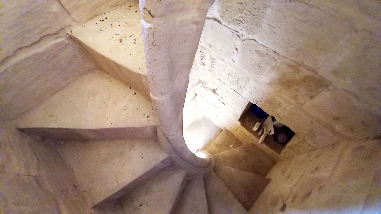From the courtyard, a traditional garigor spiral staircase leads to the roof area.